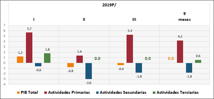 Finalmente, durante los 9 meses transcurridos de 2019 respecto al mismo periodo de 2018, el valor de la actividad económica registra un crecimiento igual a cero, resultados de la baja en las actividades secundarias (industria) en un 1.8 %, un ligero aumento del 0.6% en las terciarias (servicios) y un incremento del 4.2% del sector primario (agropecuario).