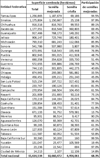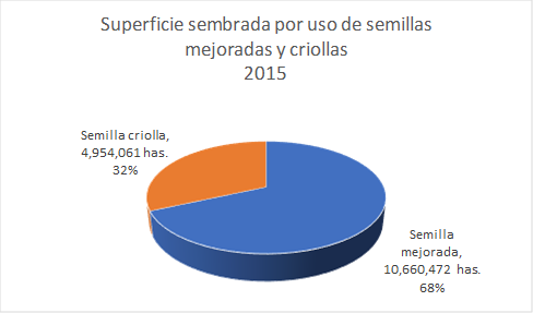 1.- El Servicio de Información Agroalimentaria y Pesquera (SIAP) de la Sagarpa en el 2015, estimó que el uso de semillas mejoradas en los cultivos cíclicos en México fue en 10.6 millones de hectáreas y que representa el 68 por ciento de la superficie sembrada. El resto de la superficie sembrada utilizó semillas criollas, las cuales son obtenidas directamente por los productores de los cultivos que realizan o de otros productores. Cabe mencionar que de acuerdo a datos de la Encuesta Nacional Agropecuaria 2017, la Unidades de Producción que se estima utilizan semillas criollas fue del 77.5 por ciento, situación que nos indica que la mayor parte de los productores utiliza este tipo de semillas y por ser menor la superficie donde la utilizan, muestra que es la semilla que los pequeños productores usan.