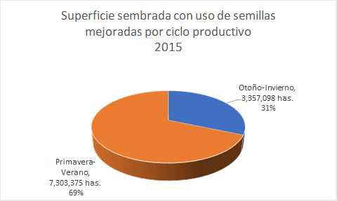 3.- En lo que respecta a los ciclos agrícolas, el 69 por ciento de la superficie sembrada con uso de semillas mejoradas se realiza en el ciclo primavera verano y el 31 por ciento en el otoño-invierno.
